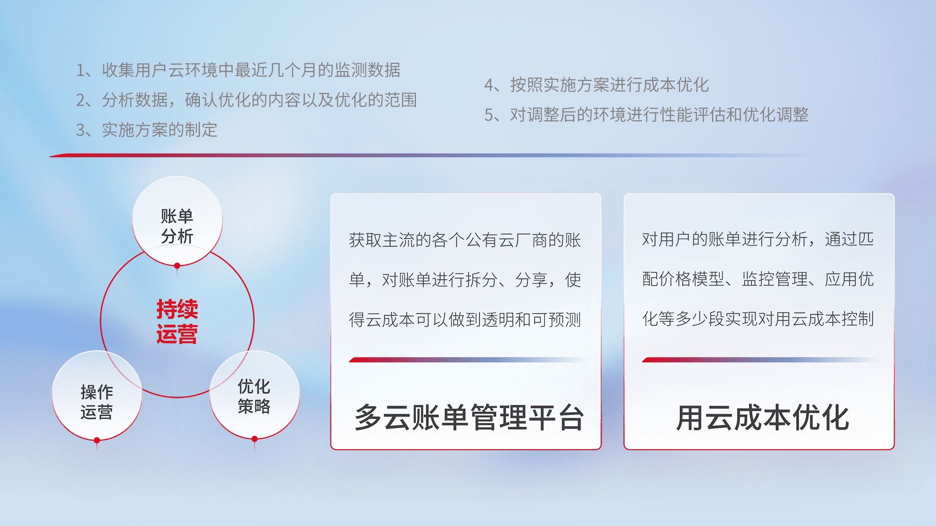 通过多云纳管,,以统一的资源数据模型把客户的云资源进行抽象和封装,,进而实现对多云资源的统一操作,,,,保障云资源管理的可靠性、、、稳定性与可用性。。。。量身定制化运维内容,,配置、、、、开发运维、、、补丁管理、、、、备份、、监控、、、、认证和访问管理、、、、审计和日常巡检等,,保障在用云过程中的可靠度,,,稳定度以及高可用率。。